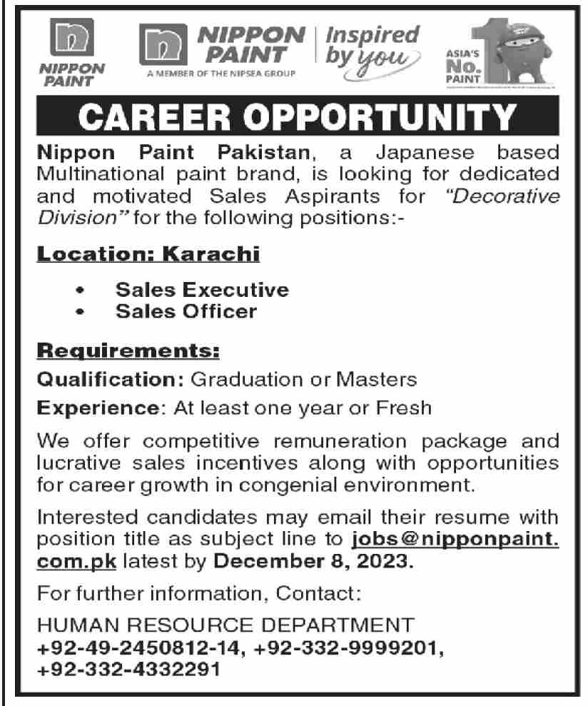 Nippon Paint Pakistan invites applications for job positions advertised in daily Dawn dated 6 December 2023 for following vacancies in Kasur, kasur Punjab Pakistan.