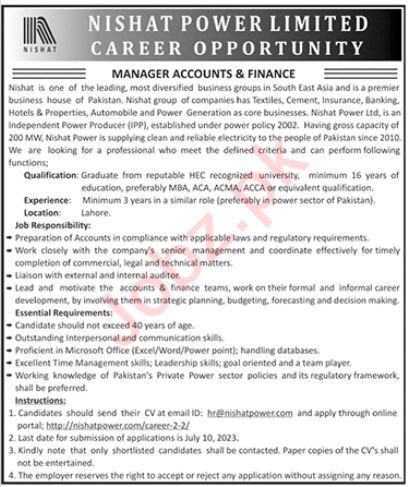 Nishat Power Limited is looking for candidates for following posts as per job advertisement published in daily Jang Newspaper of June 18, 2023 for location Lahore, lahore Punjab Pakistan: