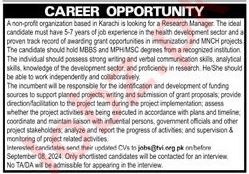 Vacant posts including research manager are announced in Non Profit Organization Karachi, karachi Sindh Pakistan as per 1 September 2024 advertisement in daily Jang Newspaper. M.sc, Others and MBBS etc. educational qualification will be preferred.