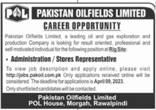 Vacant posts including administration representative and store representative are announced in Pakistan Oilfields Limited POL Rawalpindi, rawalpindi Punjab Pakistan as per 2 April 2023 advertisement in daily Jang Newspaper. Educational qualifications required Bachelor and Master etc.