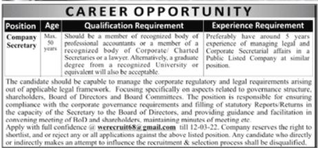 Private Company Lahore, lahore Punjab Pakistan invites applications from eligible candidates for the post of company secretary as per advertisement of February 27, 2022 published in daily Jang Newspaper. Persons with ACCA, LLM and Master etc. education can apply.