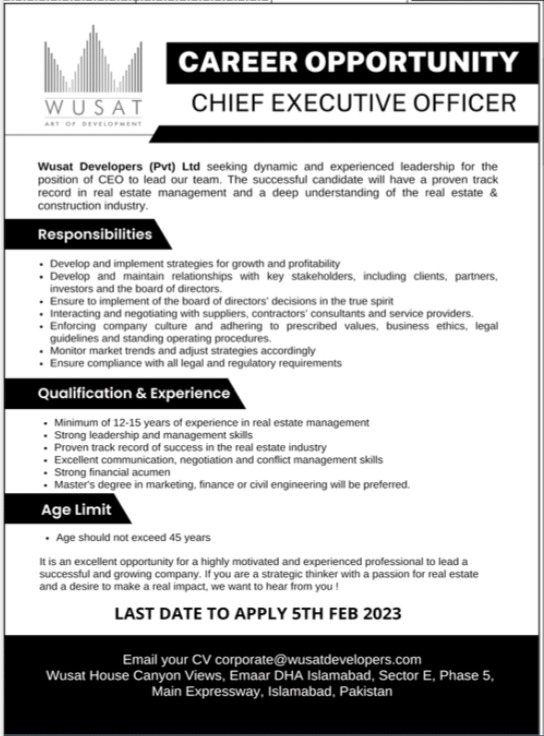 Vacancies in Wusat Developers Pvt Ltd Advertisement January 2023