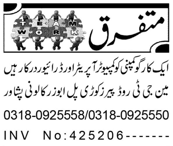 Cargo Company jobs advertisement dated about 6 October 2023 in daily Aaj Newspaper invites application for the vacant post of computer operator and driver in Peshawar, peshawar Khyber Pakhtunkhwa KPK Pakistan. Persons with Bachelor, BA, Intermediate and Matric etc. education can apply.