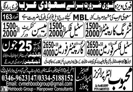 Mehboob Enterprises Overseas Employment Promoters jobs advertisement dated about 23 June 2023 in daily Express Newspaper invites application for the vacant post of mason, carpenter foreman, steel fixer, steel fixer foreman, concrete worker and shuttering carpenter in Makkah, jeddah Saudi Arabia. Educational qualifications required Matric, Bachelor, DAE and Intermediate etc.