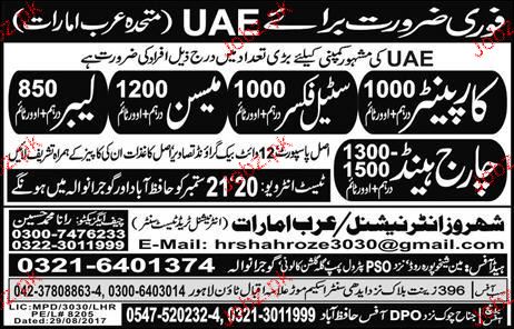 Carpenters, Steel Fixers, Mason, Labors and Charge Hand are required in UAE. Food, Medical and Residence will be provided by the Company. Test and Interview will be held on 21 September 2017.