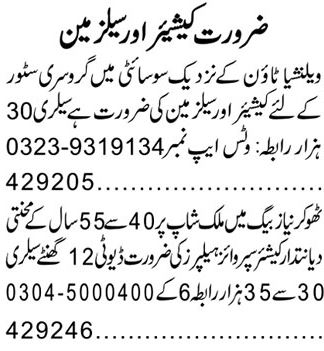 Private Sector jobs advertisement dated about 6 January 2024 in daily Roznama 92 News Newspaper invites application for the vacant post of salesman, cashier, supervisor and helper in Lahore, lahore Punjab Pakistan. Preferred Education is Bachelor, Middle and Intermediate etc.