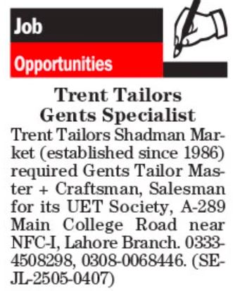 Apply as per details in job advertisement. Login to view further details of how to apply via https://www.jobz.pk online.