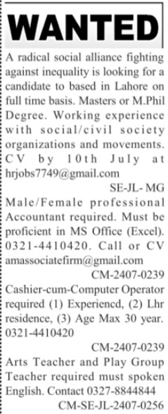 Private Company invites applications for job positions advertised in daily Jang dated 9 July 2024 for following vacancies in lahore Punjab Pakistan.