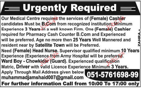 Cashiers, Head Nurses, Ward Boys and Chawkidars Wanted