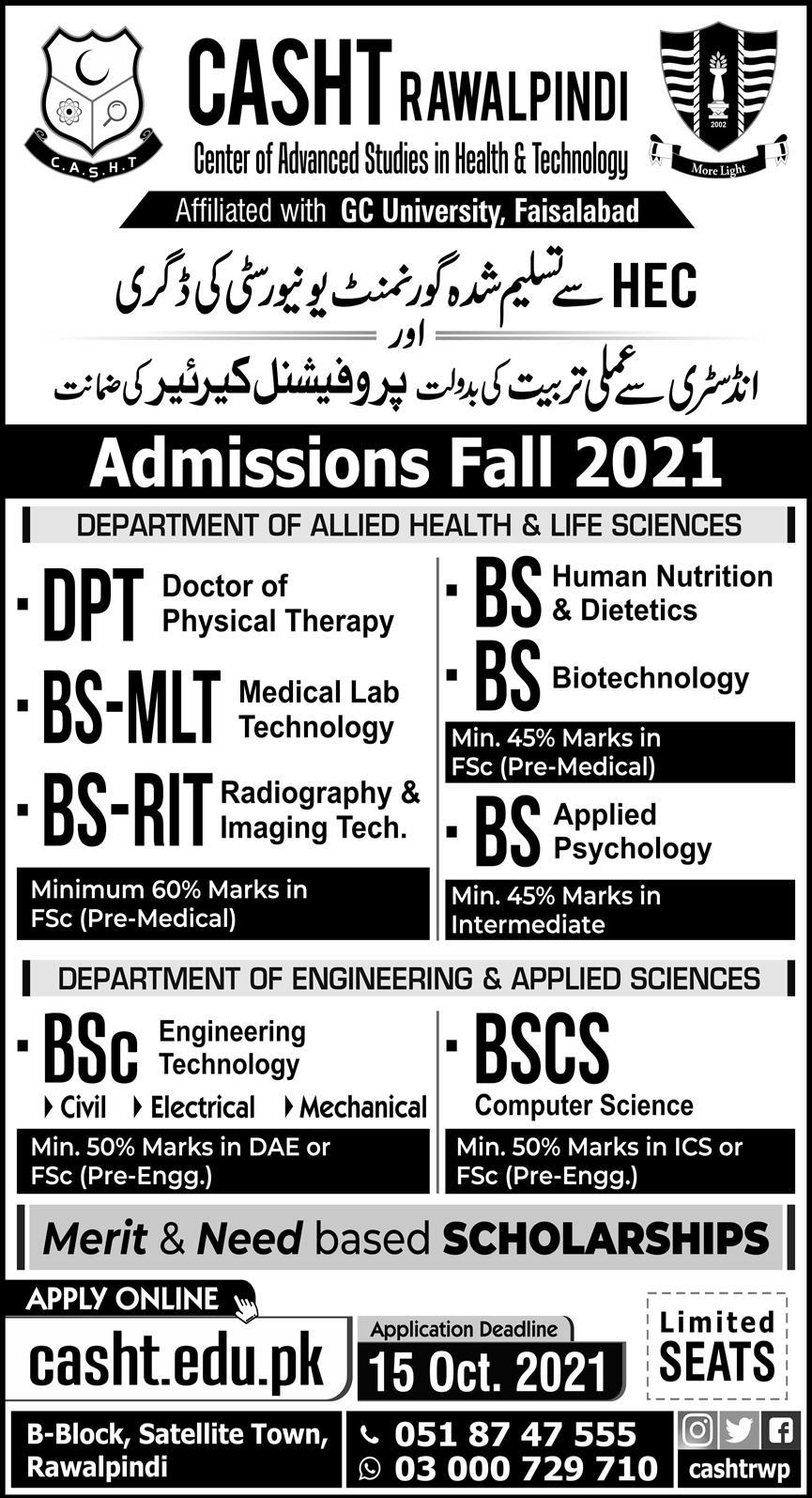 Center of Advanced Studies in Health & Technology CASHT, Rawalpindi has announced admissions in various programs like DPT, BS, BSc, MLT, BSCS in Rawalpinid. Read newspaper ad for exact details.