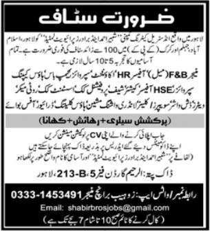 Vacant posts including HSE Officer, Driver, Supervisor, Accountant, Cook, Officer HR, Cleaner, Assistant Cook and Manager F B are announced in Catering Company Lahore, Karak, Islamabad and Jhelum Punjab Pakistan as per 23 January 2022 advertisement in daily Jang Newspaper. Persons with Bachelor, Middle, Matric and Intermediate etc. education can apply.