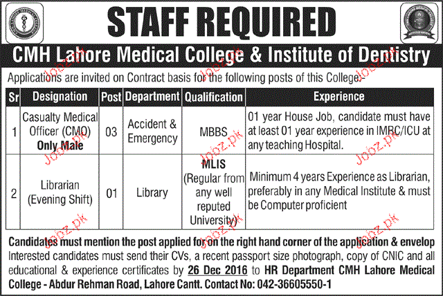 Causality Medical Officers And Librarian Job In CMH Lahore