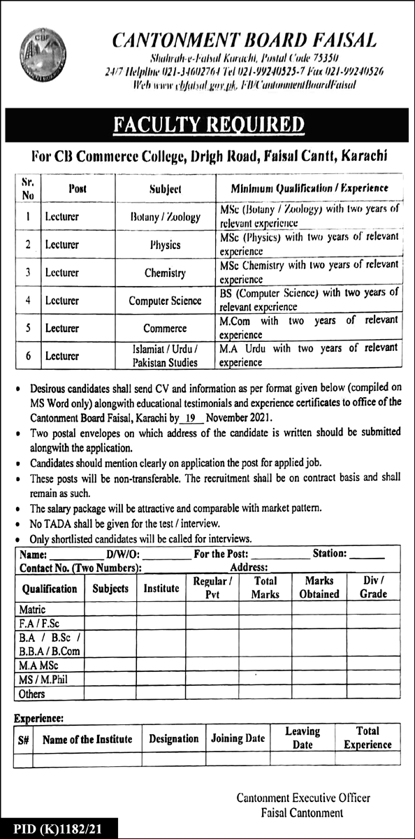 CB Commerce College Faisal Cantt Karachi Jobs 2021 Lecturers