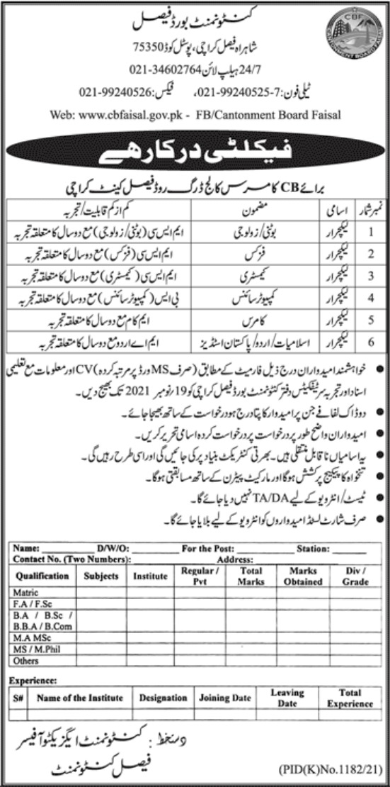 CB Commerce College, Faisal Cantt Karachi seeking applications from qualified and experienced candidates for the vacant positions of Lecturer Botany, Lecturer Zoology, Lecturer Physics, Lecturer Chemistry, Lecturer Computer Science, Lecturer Commerce, Lecturer Islamiat, Lecturer Urdu, Lecturer Pak Studies