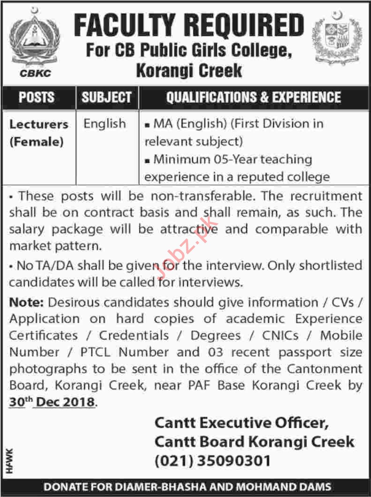 CB Girls College Korangi Creek Jobs 2018 For Lecturers