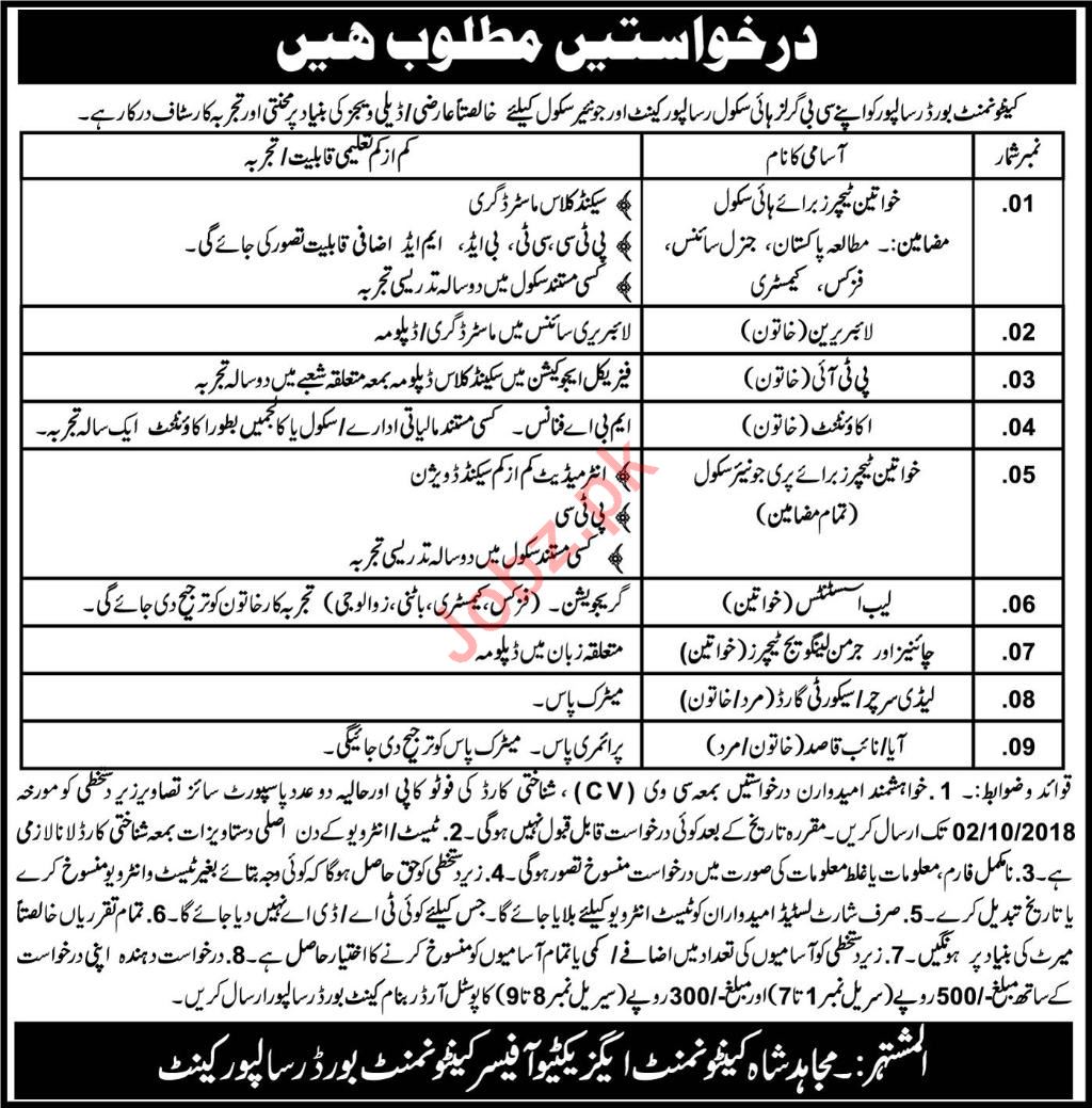 Vacancies in Cantt Public School and Girls College Advertisement September 2018