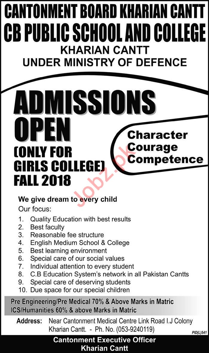 Cantonment Board CB Public School And College Under Ministry of Defence Government of Pakistan Admissions open only for Girls College Fall 2018 in Kharian Cantt Punjab 2018. Read newspaper ad for exact details.