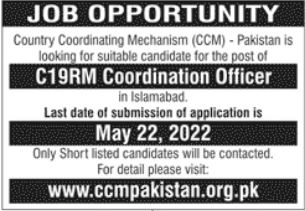 Country Coordinating Mechanism CCM Pakistan jobs advertisement dated about 8 May 2022 in daily Jang Newspaper invites application for the vacant post of coordination officer in Islamabad, islamabad Islamabad Pakistan. Educational qualifications required Bachelor and Master etc.