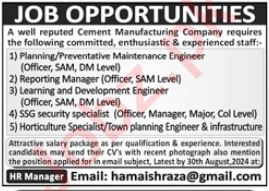 Cement Manufacturing Company Lahore, lahore Punjab Pakistan invites applications from eligible candidates for the post of horticulture specialist, maintenance engineer, planning engineer, learning development engineer, ssg security specialist and reporting manager as per advertisement of August 25, 2024 published in daily Jang Newspaper. Educational qualifications required Intermediate, Master and Bachelor etc.