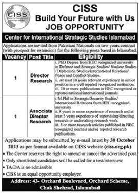 Center for International Strategic Studies CISS jobs advertisement dated about 16 October 2023 in daily The News Newspaper invites application for the vacant post of director research and associate director research in Islamabad, islamabad Islamabad Pakistan. Educational qualifications required Phd and Mphil etc.