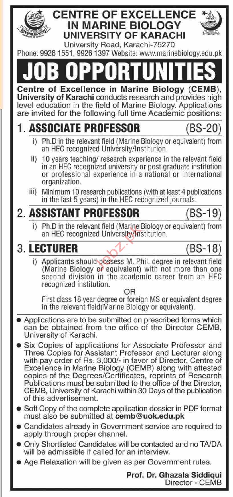 University of Karachi invites applications from highly qualified and experienced persons for the following vacant positions for Center of Excellence in Marine Biology. Associate Professor Marine Biology, Assistant Professor Marine Biology, Lecturer Marine Biology.