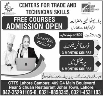 Centers For Trade & Technician Skills, Punjab Skills Development Fund PSDF has announced admissions for courses in Front Office Management & Professional Cook in Lahore. Read newspaper ad for exact details.