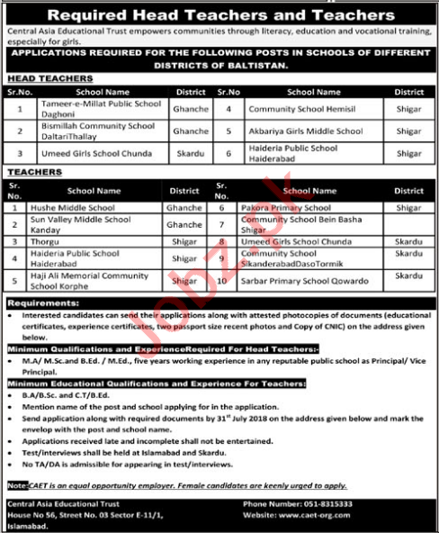 Central Asia Educational Trust CAET Skardu Teachers Jobs