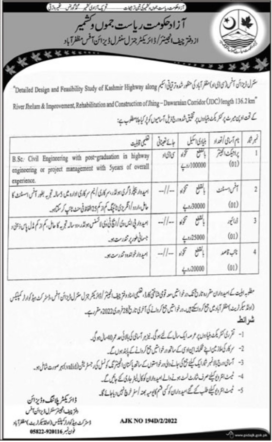 Planning and Development Department invites applications for job positions advertised in daily Mahasib dated 11 February 2022 for following vacancies in Muzaffarabad AJK Pakistan.