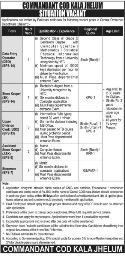 Central Ordnance Depot COD Jhelum Jobs 2023