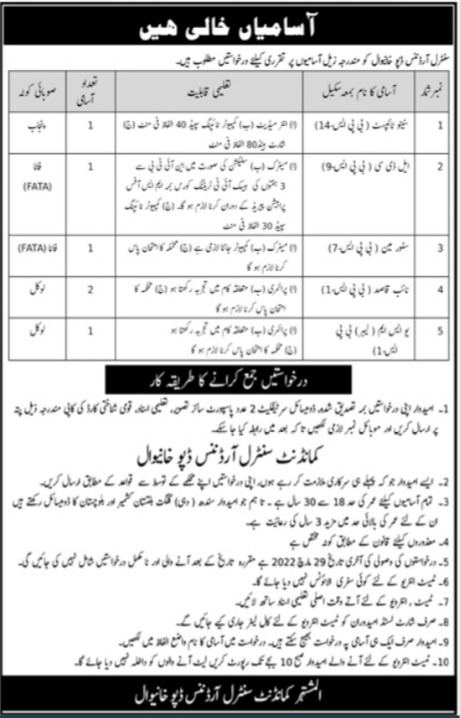 Central Ordnance Depot COD invites applications for job positions advertised in daily Jang dated 13 March 2022 for following vacancies in Khanewal, khanewal Punjab Pakistan.