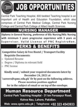 Central Park Nursing College Lahore Jobs 2021