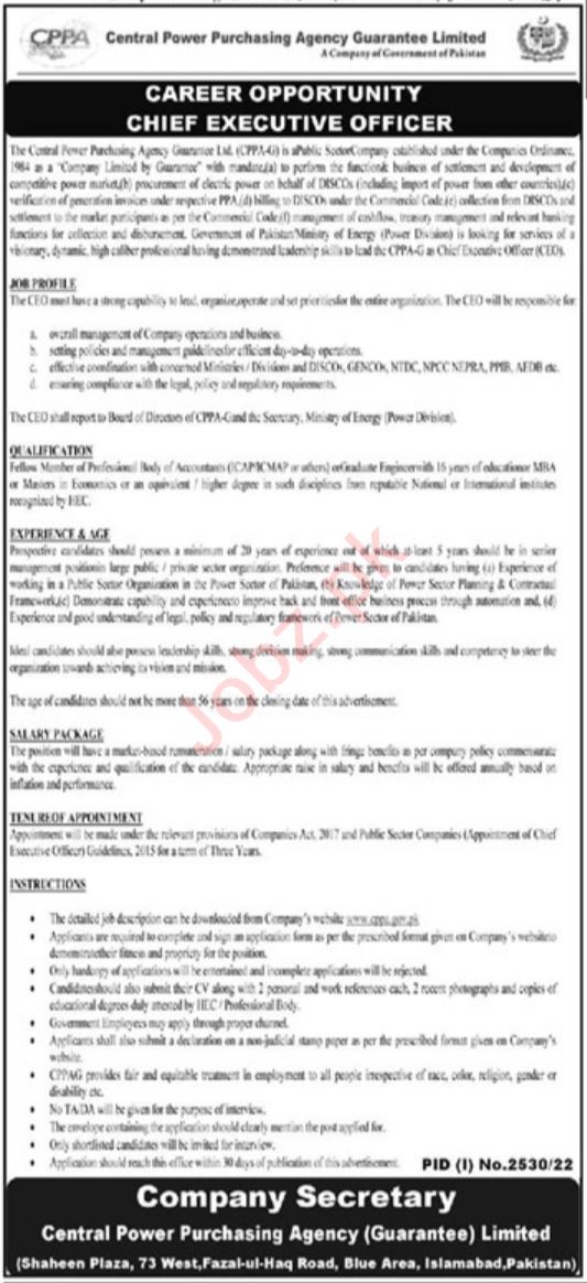 Central Power Purchasing Agency Guarantee Limited CPPAG jobs advertisement dated about 23 October 2022 in daily Khabrain Newspaper invites application for the vacant post of chief executive officer in Islamabad, islamabad Islamabad Pakistan. Preferred Education is Master, Bachelor and MS etc.