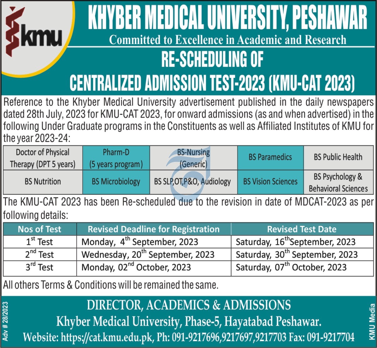 Khyber Medical University Peshawar admissions 2023 for DPT, Pharm D, BS Program has been announced. Eligible students who qualify as per admission criteria in Khyber Medical University Peshawar Peshawar Khyber Pakhtunkhwa KPK Pakistan can apply in Medical University for academic year 2023. Eligible students for fulfilling criteria for admissions in BS, Pharm D and DPT can enroll as per Private admission policy 2023 till closing date 4 September 2023. Read newspaper ad for exact details.
