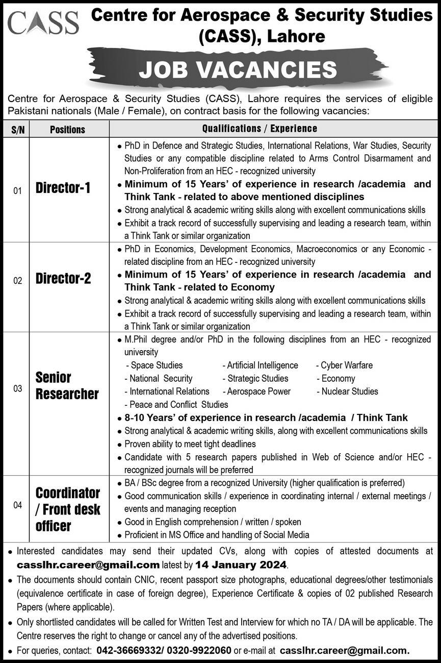Centre of Aerospace & Securities Studies CASS Lahore, lahore Punjab Pakistan invites applications from eligible candidates for the post of coordinator, researcher, director ii, front desk officer and director i as per advertisement of January 4, 2024 published in daily Express Newspaper. Persons with Mphil, Phd, Master, BA, MS and Bachelor etc. education can apply.