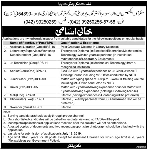 Centre of Excellence in Water Resources Engineering is looking for highly energetic and experienced candidates for the posts of Assistant Librarian, Laboratory Supervisor, Superintendent, Technician, Clerk, Driver, Mali, Chowkidar, Sweeper in Lahore. Candidates can apply till July 12, 2019.
