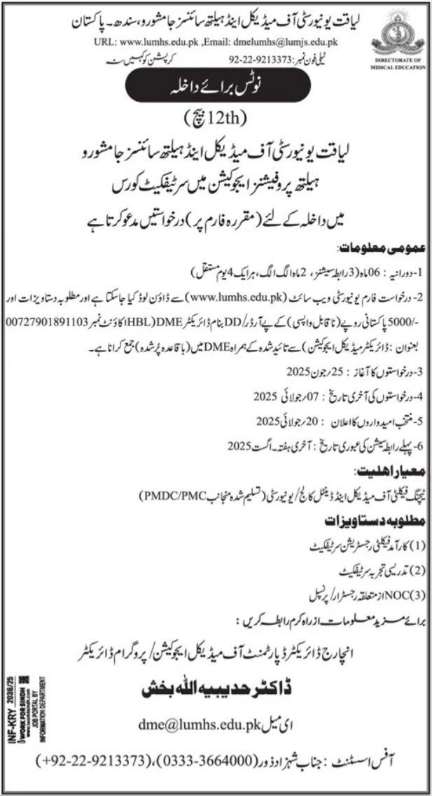 Admissions in Liaquat University of meidcal & Health Sceinces Thatta Sindh 2025 for Certificate Course has been announced. Students can enroll for admissions in Liaquat University of meidcal & Health Sceinces Thatta Sindh Thatta Sindh Pakistan for academic year 2025 to continue campus based or online education in Science University. Students for admissions in & criteria can apply as per Government institute admission policy 2025 before closing date as per advertisement. Read newspaper ad for exact details.