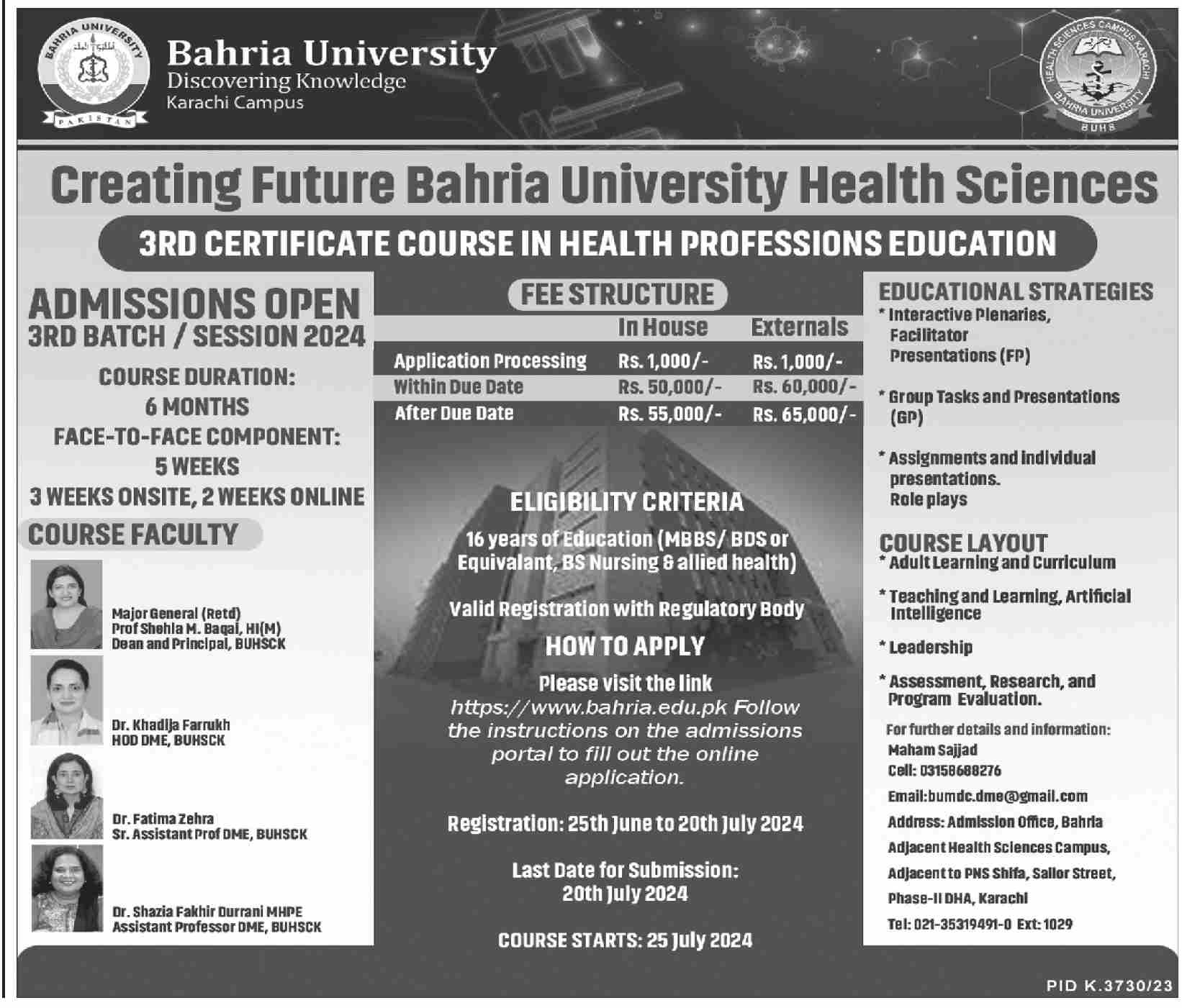 Admissions in Bahria University 2024 for Certificate in Health Professions Education has been announced. Eligible students who qualify as per admission criteria in Bahria University Karachi Sindh Pakistan can apply in Medical University for academic year 2024. Students who want to enroll for academic session 2024 in Course qualification and admission criteria for Private institute can apply till last date 20 July 2024. Read newspaper ad for exact details.