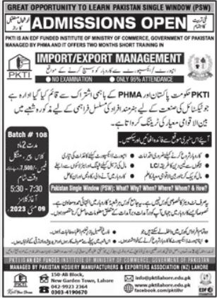 Pakistan Knitwear Training Institute PKTI Import Management, Export Management admissions 2023 has been announced. Pakistan Knitwear Training Institute PKTI Lahore Punjab Pakistan welcomes students to apply for admissions in academic year 2023 in Medical College. Eligible candidates for admissions in Course can apply as per Private institute criteria and before closing date 6 May 2023 after reading advertisement online. Read newspaper ad for exact details.