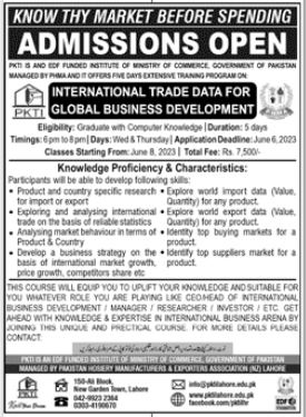 Pakistan Knitwear Training Institute PKTI International Trade Data for Global Business Development admissions 2023 has been started. Pakistan Knitwear Training Institute PKTI Lahore Punjab Pakistan welcomes students to apply for admissions in academic year 2023 in Management College. Students who want to enroll for academic session 2023 in Course qualification and admission criteria for Private institute can apply till last date 4 July 2023. Read newspaper ad for exact details.