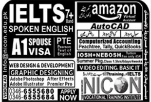 Nicon Vocational Training Institute admissions 2023 for IELTS Spoken English, Web Design and Development, Graphic Designing, Adobe Photoshop, Adobe Illustrator, Civil Surveyor, Quantity Surveyor, Draftsman, IOSH, NEBOSH has been announced. Students can enroll for admissions in Nicon Vocational Training Institute Rawalpindi Punjab Pakistan for academic year 2023 to continue campus based or online education in Management Course. Eligible candidates for admissions in Course can apply as per Private institute criteria and before closing date 19 April 2023 after reading advertisement online. Read newspaper ad for exact details.