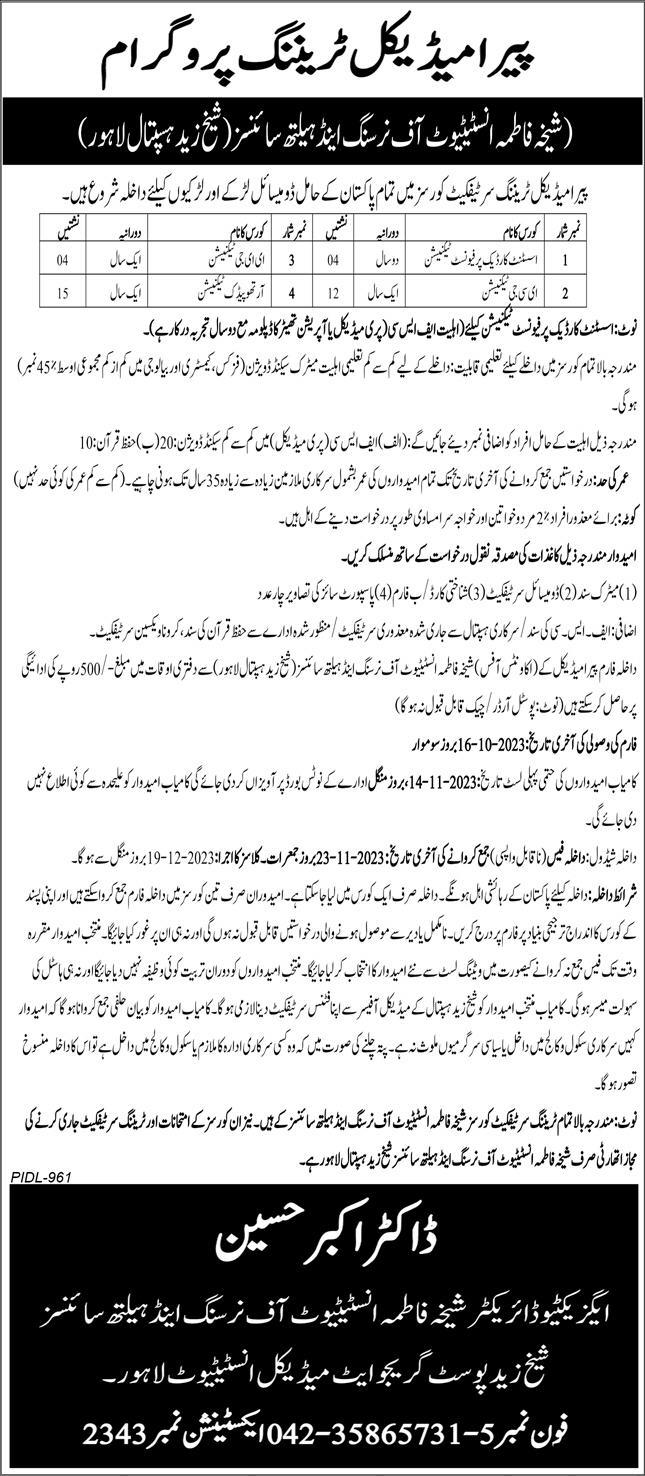 Shaikha Fatima Institute of Nursing and Health Sciences admissions 2023 for Assistant Cardiac Perfusionist Technician, ECG Technician, EEG Technician, Orthopedic Technician has been announced. Eligible students can apply for academic admissions 2023 in Shaikha Fatima Institute of Nursing and Health Sciences Lahore Punjab Pakistan for Medical Course. Eligible candidates for admissions in Course can apply as per Government institute criteria and before closing date 16 October 2023 after reading advertisement online. Read newspaper ad for exact details.