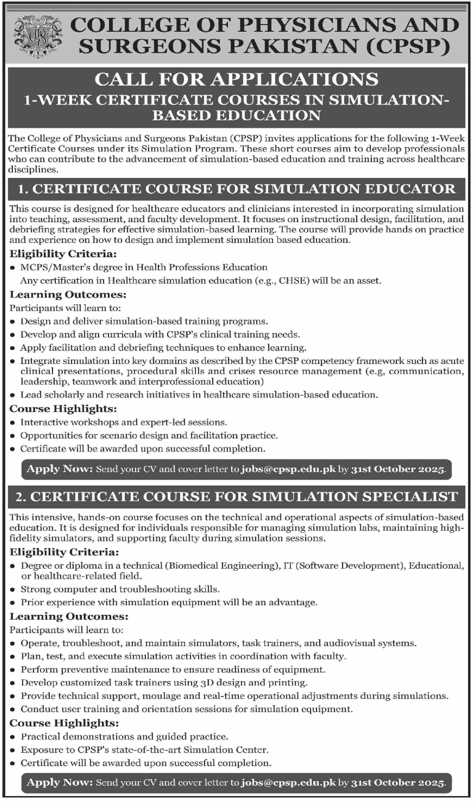 Vacant posts including simulation specialist and simulation educator are announced in College of Physicians and Surgeons Pakistan Karachi, karachi Sindh Pakistan as per 19 October 2025 advertisement in daily Dawn Newspaper. Candidates with Master etc. educational background will be preferred.