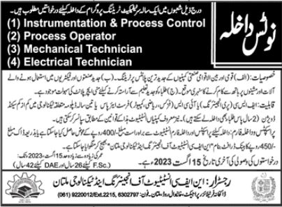 NFC Institute of Engineering & Technology has announced admissions 2023 for Certificate Courses. Eligible students can apply for academic admissions 2023 in NFC Institute of Engineering & Technology Multan Punjab Pakistan for Technical University. Students for admissions in Course & criteria can apply as per Government institute admission policy 2023 before closing date August 15, 2023 as per advertisement. Read newspaper ad for exact details.