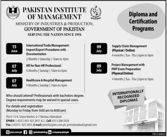 Pakistan Institute of Management Courses, Diploma admissions 2024 has been announced. Pakistan Institute of Management Islamabad Islamabad Pakistan welcomes students to apply for admissions in academic year 2024 in Management College. Students for admissions in Course and Diploma & criteria can apply as per Government institute admission policy 2024 before closing date June 24, 2024 as per advertisement. Read newspaper ad for exact details.