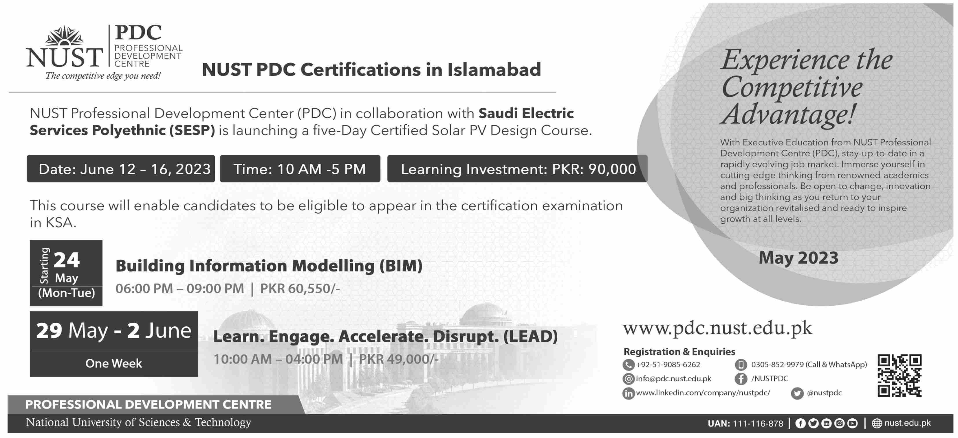 National University of Science & Technology NUST has announced admissions 2023 for Building Information Modeling, Learn Engage, Accelerate Disrupt. National University of Science & Technology NUST Islamabad Islamabad Pakistan welcomes students to apply for admissions in academic year 2023 in Management University. Eligible candidates for admissions in Course can apply as per Government institute criteria and before closing date 20 May 2023 after reading advertisement online. Read newspaper ad for exact details.