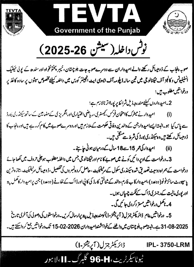 Technical Educational & Vocational Training Authority AJKTEVTA COURSES admissions 2025 has been announced. Eligible students can apply for academic admissions 2025 in Technical Educational & Vocational Training Authority AJKTEVTA Lahore Punjab Pakistan for Science College. Students who want to enroll for academic session 2025 in qualification and admission criteria for Government institute can apply till last date 31 July 2025. Read newspaper ad for exact details.