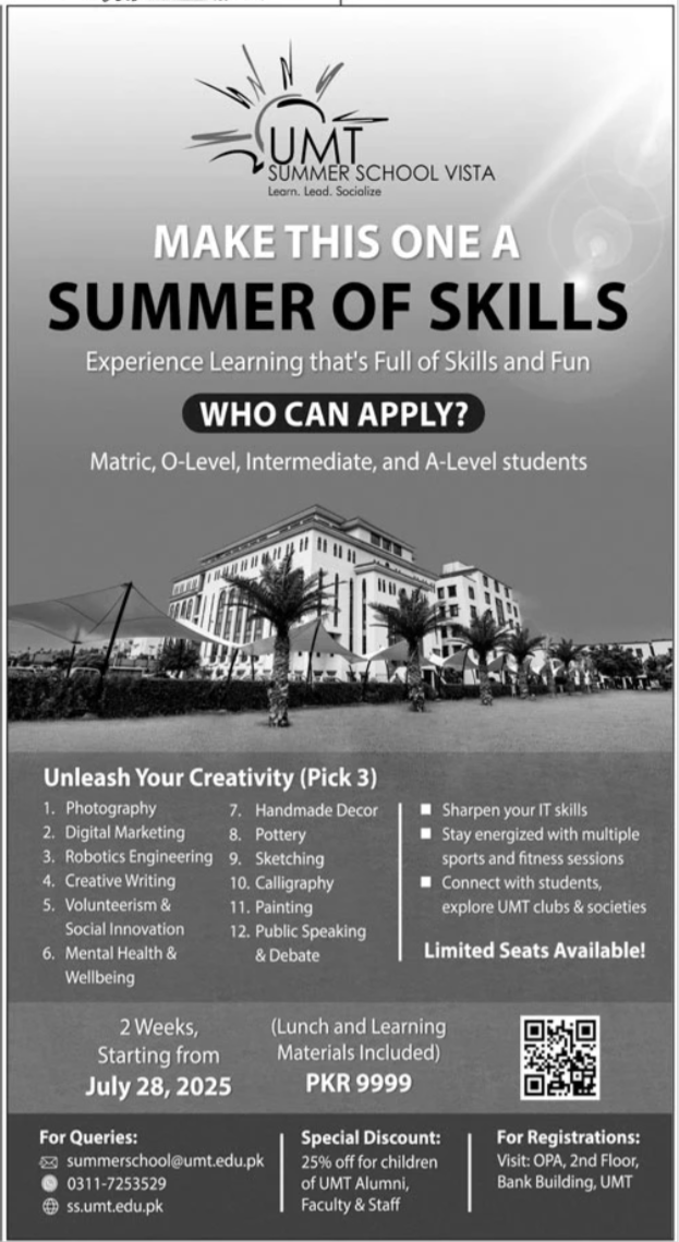Admissions in UMT Sialkot 2025 for Certified Courses has been announced. Students can enroll for admissions in UMT Sialkot Karachi Sindh Pakistan for academic year 2025 to continue campus based or online education in Science College. Eligible candidates for admissions in can apply as per Government institute criteria and before closing date after reading advertisement online. Read newspaper ad for exact details.