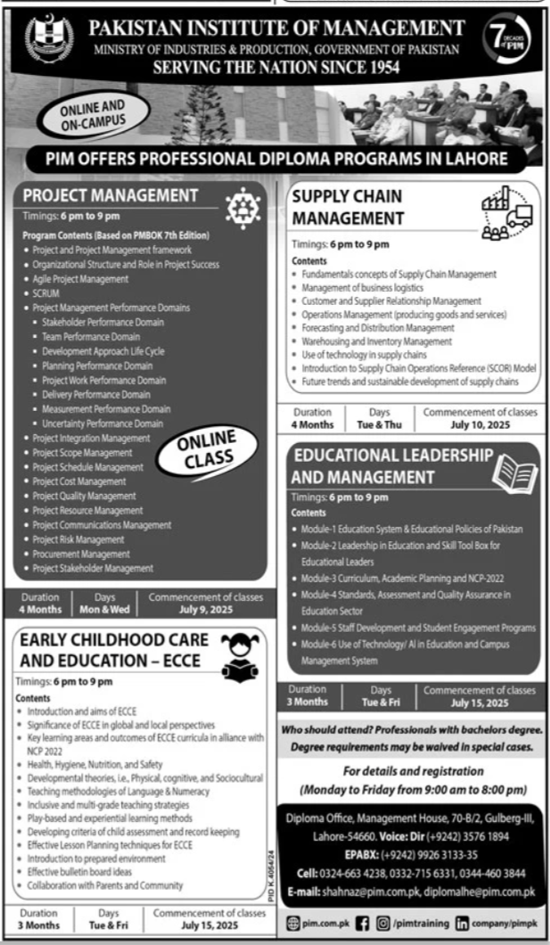 Pakistan Institute of Management has announced admissions 2025 for Certified Diploma Courses . Students who want to take admissions in Pakistan Institute of Management Karachi Sindh Pakistan for academic year 2025 to continue education in Science College can apply. Students for admissions in & criteria can apply as per Government institute admission policy 2025 before closing date as per advertisement. Read newspaper ad for exact details.