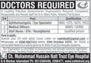 Humanitarian Organization Islamabad, islamabad Islamabad Pakistan invites applications from eligible candidates for the post of medical officer, receptionist, ota, ophthalmologist, staff nurse and eye specialist as per advertisement of October 17, 2025 published in daily Ausaf Newspaper. Bachelor, Intermediate and MBBS etc. educational qualification will be preferred.