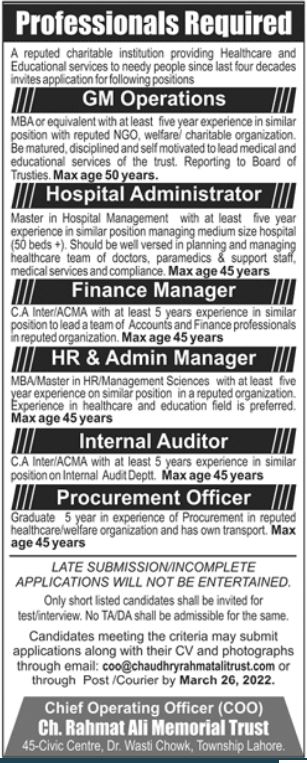 Chaudhary Rehmat Ali Memorial Trust is looking for candidates for following posts as per job advertisement published in daily Jang Newspaper of March 20, 2022 for location Lahore, lahore Punjab Pakistan: